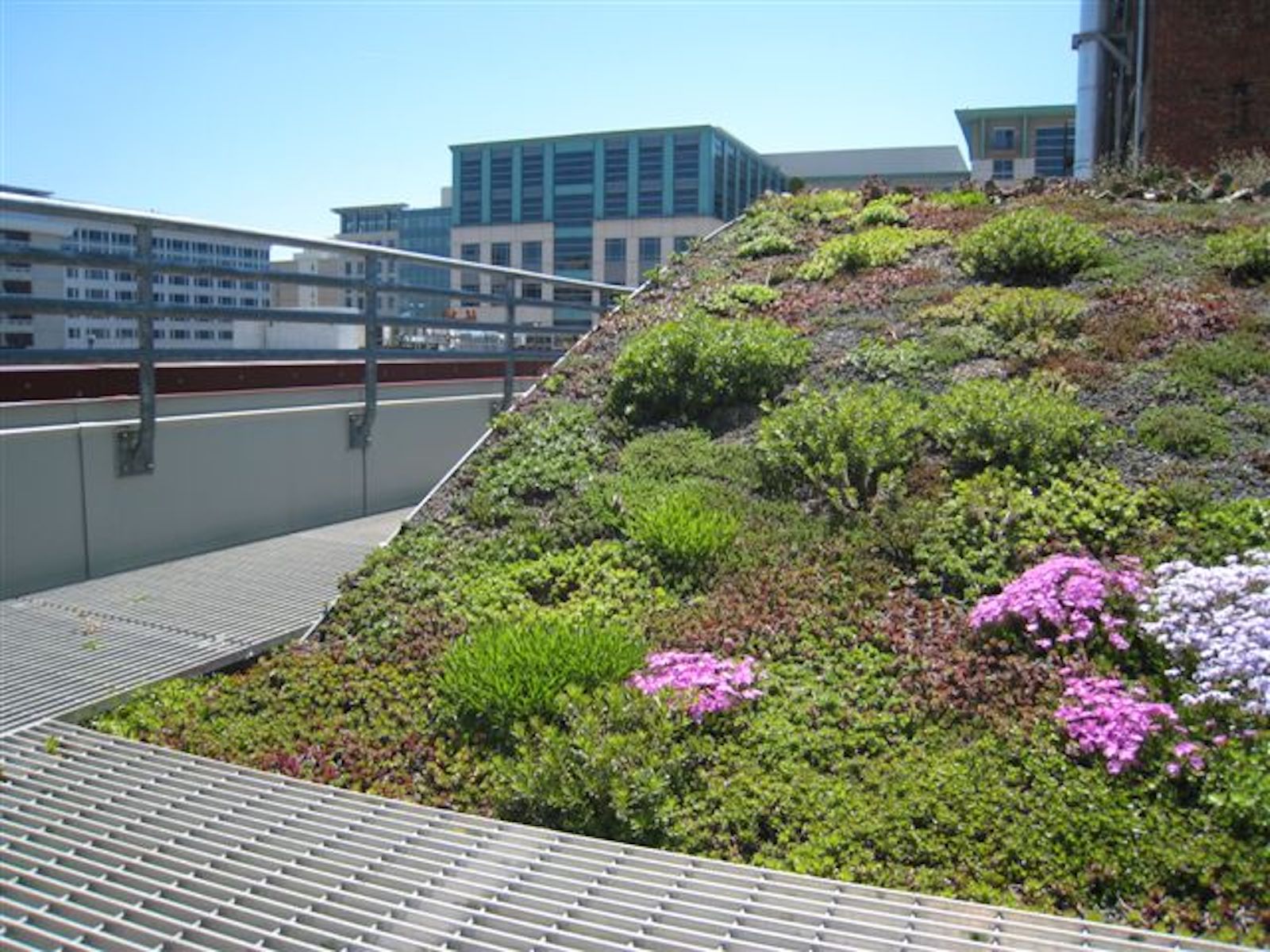 The previous black tar surfaced the roof of the ASLA headquarters building in Washington, DC, is now a landmark demonstration project, containing six distinct Garden Roof conditions, representing extensive, semi-intensive, and intensive systems ranging in growing media depth of 3 - 18 inches. Two "waves" dominate the design and allow for the greatest green coverage possible for the 3,300 square-foot roof surface. Surrounding these is a third green roof system, covered by metal grating that allows visitors to walk over the planted material. The Garden Roof Assembly® plays an integral and essential role in the roof's design.