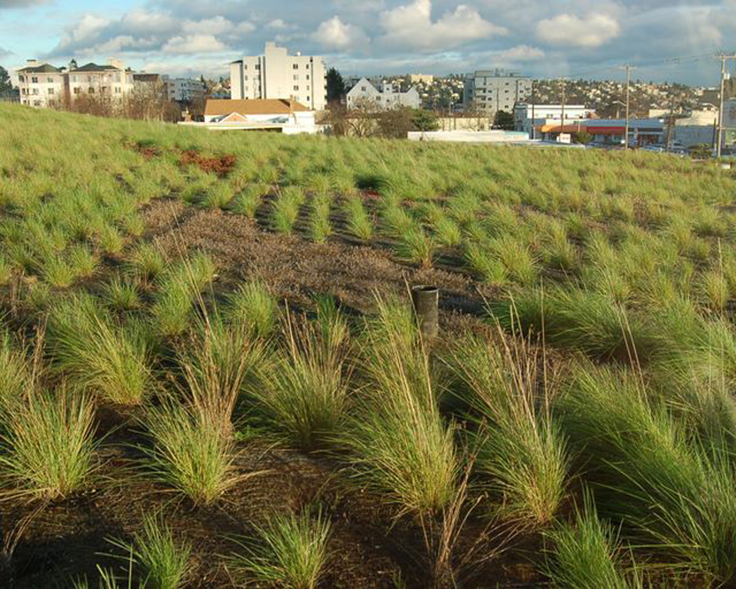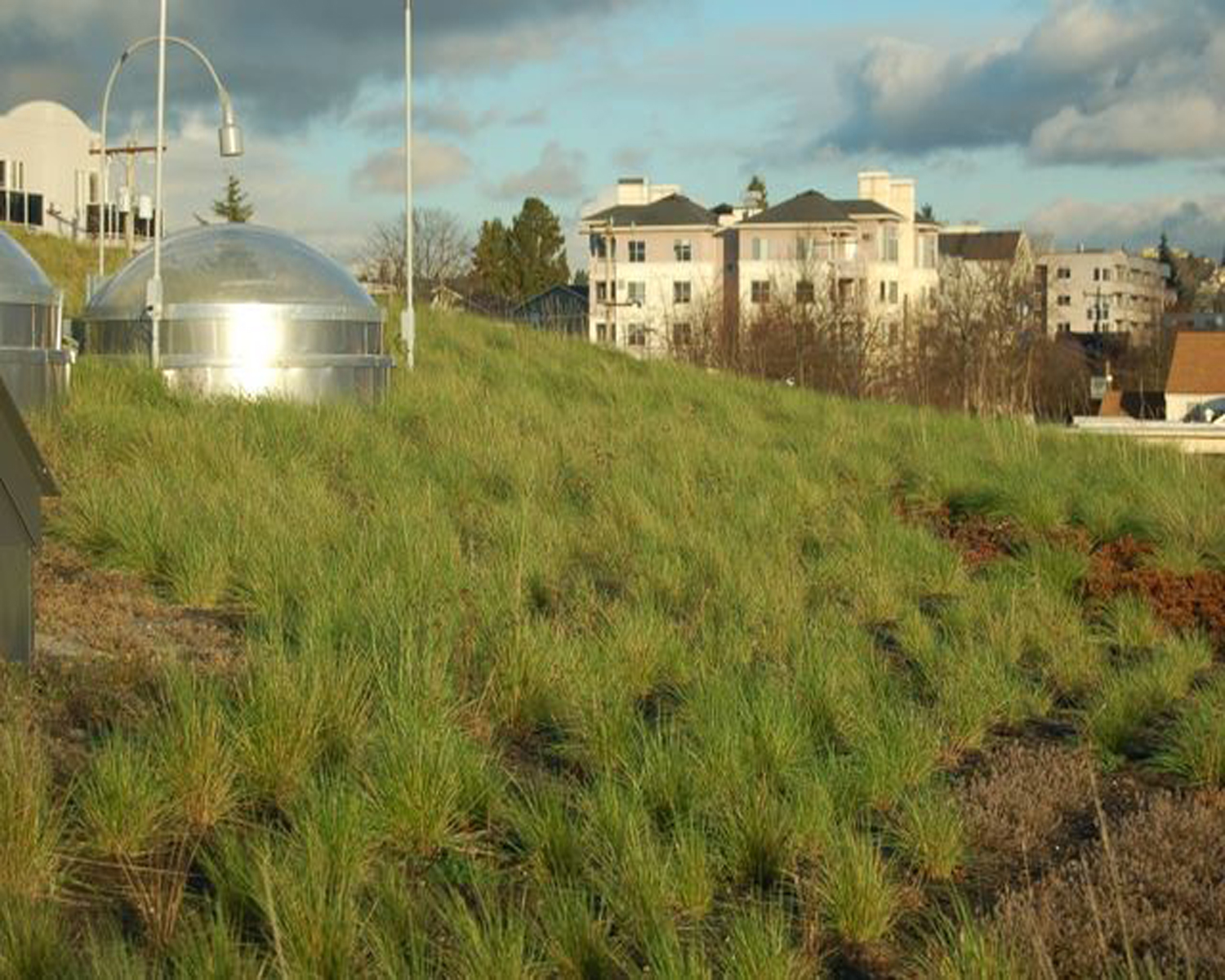 The green roof was incorporated as part of an overall strategy to reduce and conserve energy costs here possible. Solar (photovoltaic) panels provided by the Seattle City Light Green Power Panel installed on the northern edge of the roof will monitor the amount of electricity captured and collected onsite.