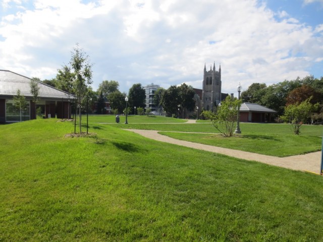 Système Garden Roof® Semi-Intensif: Surface ouverte, engazonnée et vallonnée, traversée par de multiples sentiers. D’un côté, la toiture végétale se fond au Parc Westmount. De l’autre côté, la toiture est entourée de garde-corps, laissant apparaître deux versants du bâtiment (versants Sud et Ouest). 52 600 p.c. de toiture végétale.