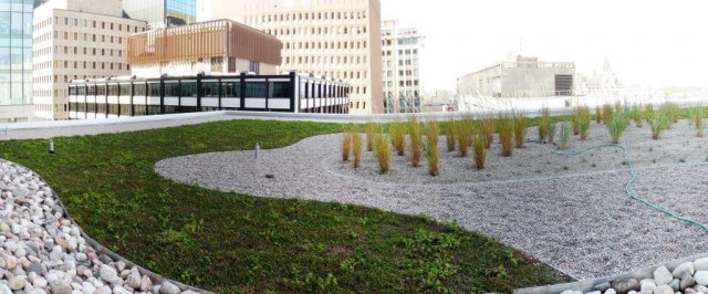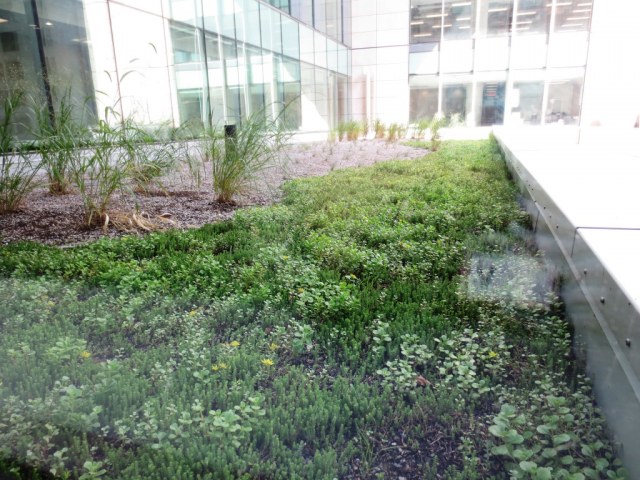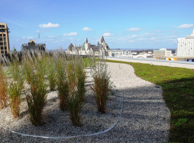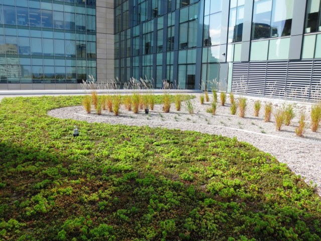 Toiture extensive avec agencement de massifs de graminées et de tapis de sédum Instagreen.  14400 pi.ca. de toiture végétale.