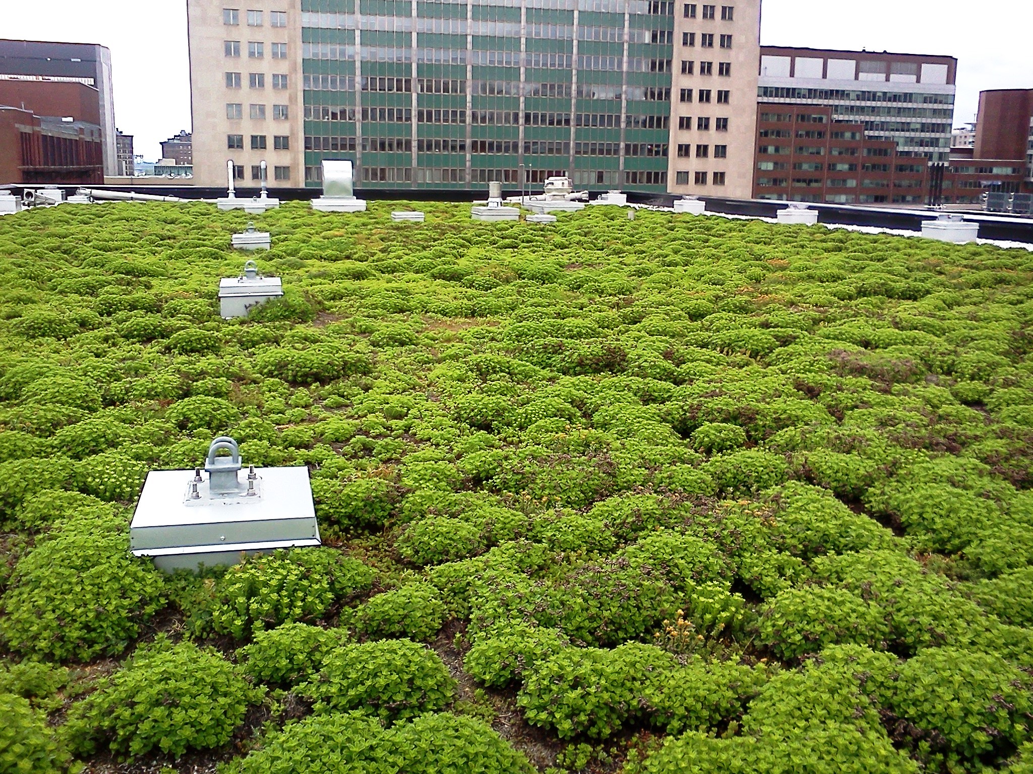 Système Garden Roof® Extensif: Surface extensive couverte du tapis de sédum Instagreen sur 75 mm de substrat de croissance. Bâtiment à vocation éducative; terrasse accessible à la toiture pour le public. 9 000 pi.ca. de toiture végétale.