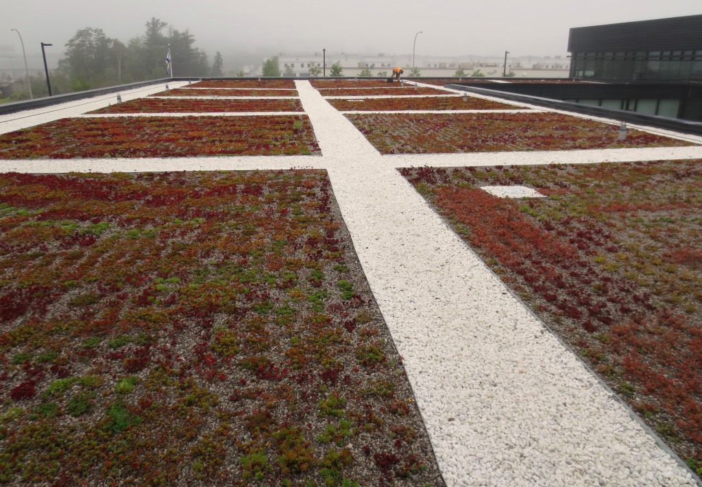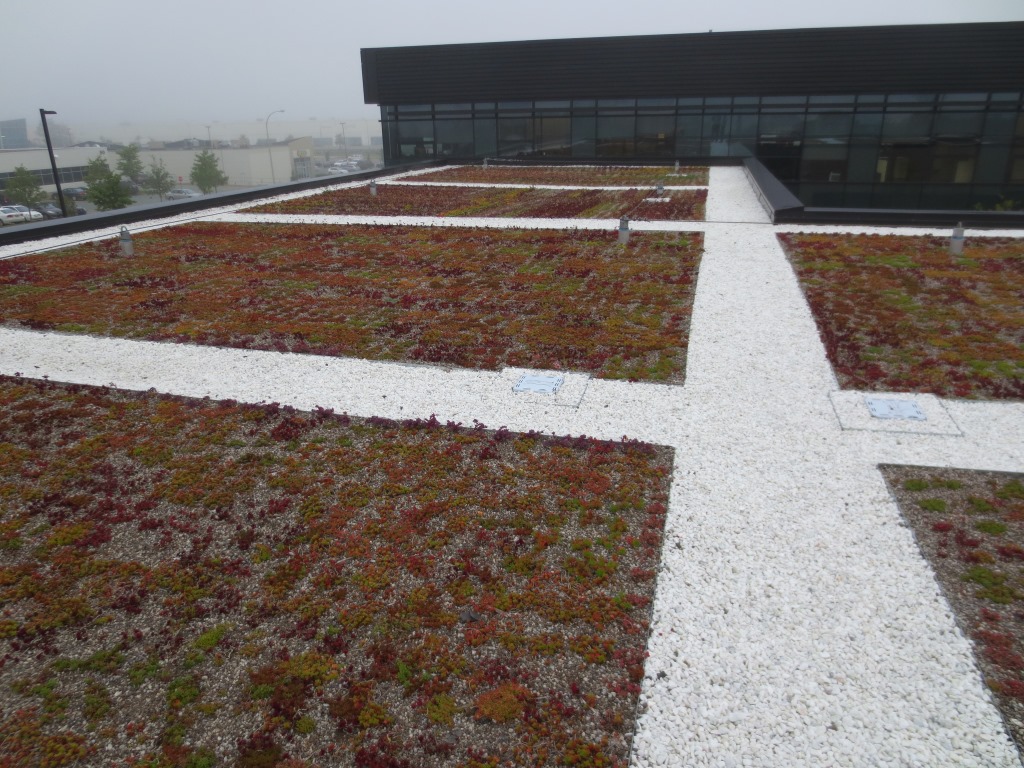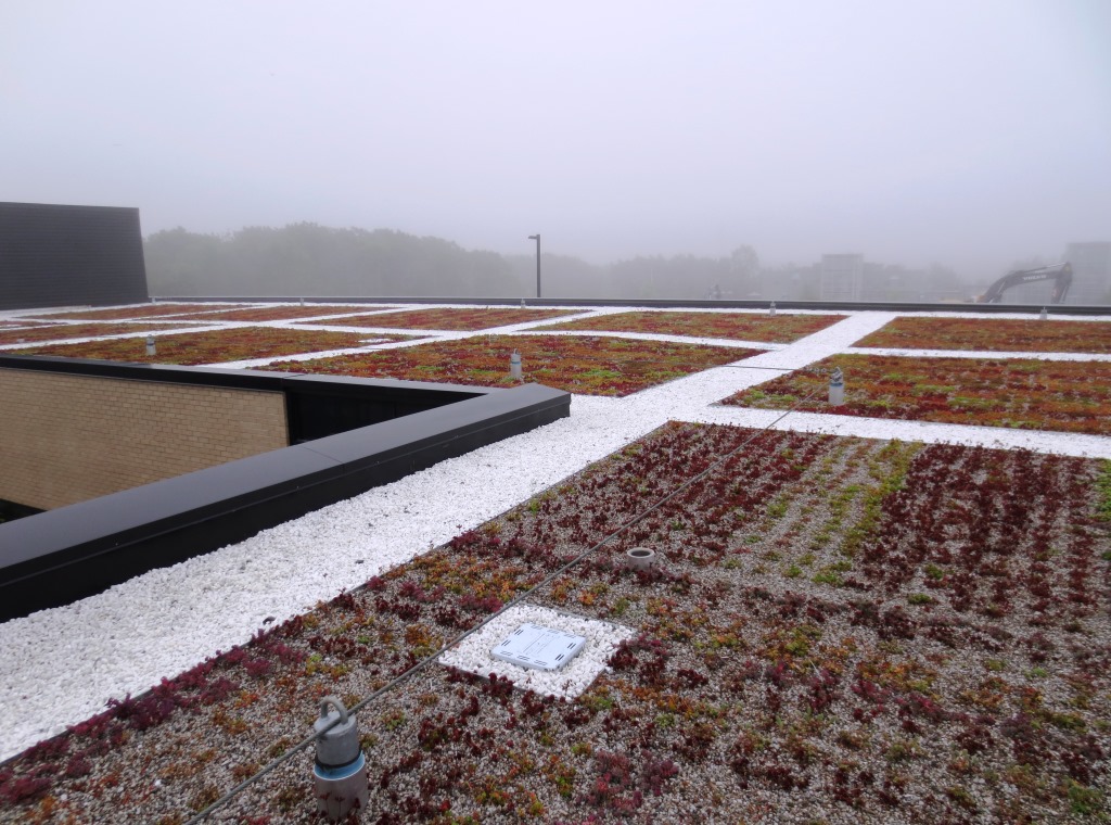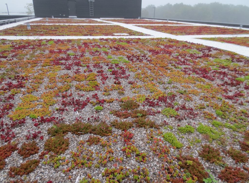 Extensive vegetative roof with sedum plugs.
