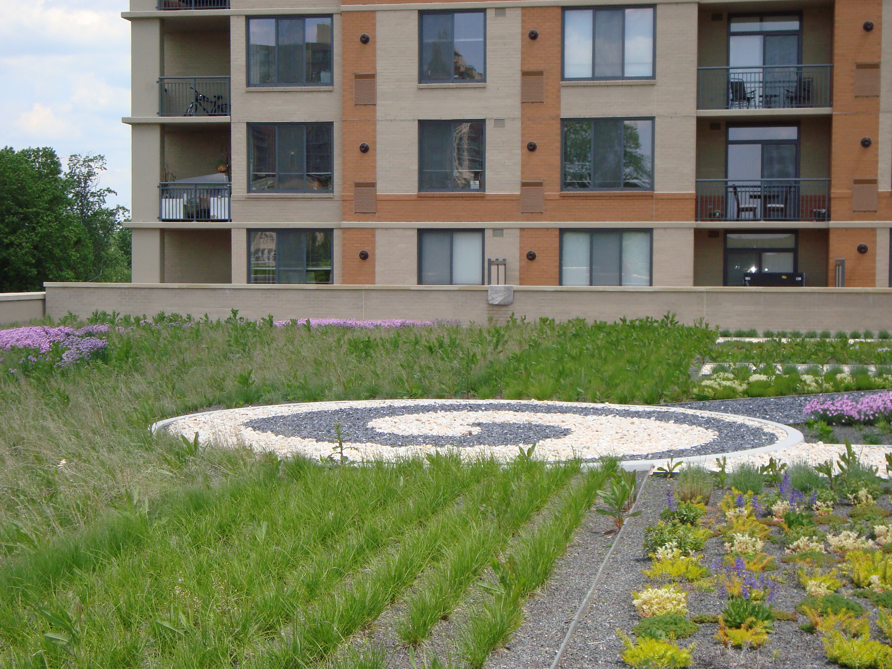 Atop a ground level retail establishment, a courtyard type layout features a combination of sedum, grasses and a wide array of plant species of various sizes and colors, all in a compelling landscape design that serves as a visual amenity for residents of the adjacent tower housing unit.