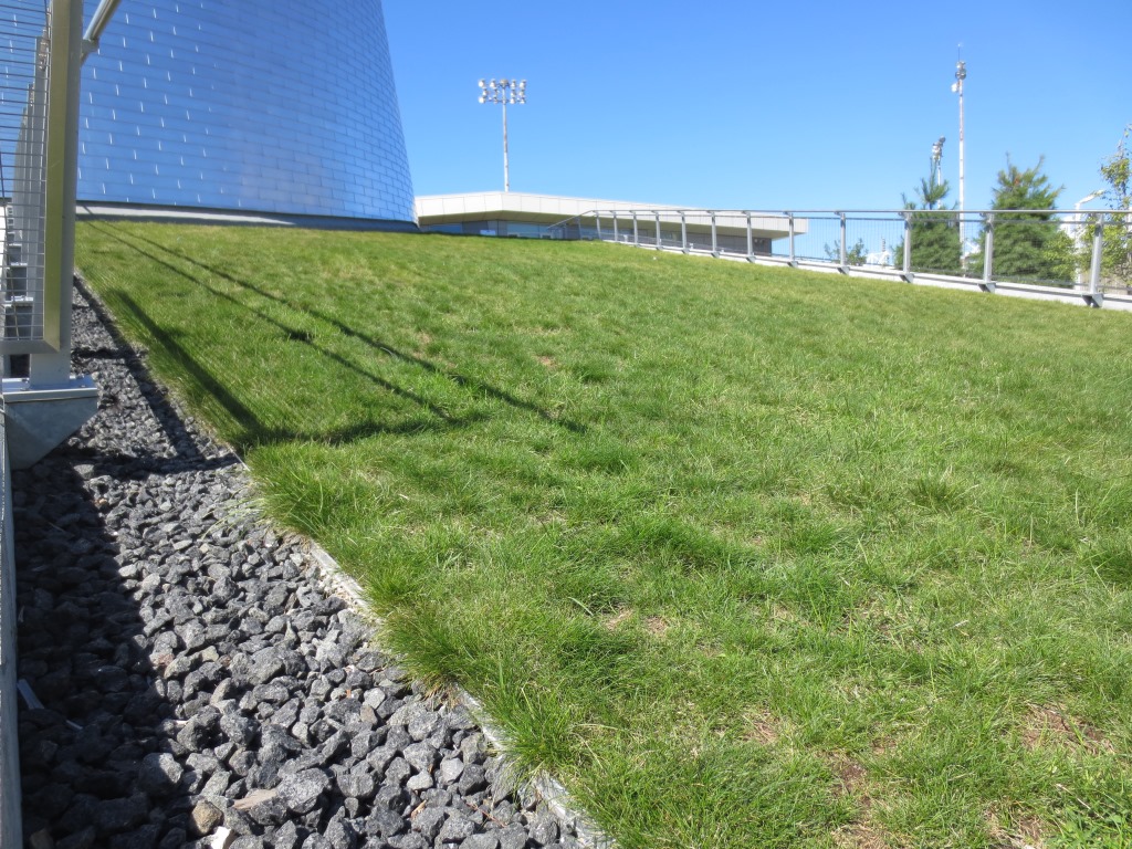 7000 p.c. de toiture végétale intensive engazonnée où le Système Garden Roof en pente a été utilisé (GardNet).  Elle est accessible au public.  Sur le plat au niveau du sol, 5000 p.c. de superficie en imperméabilisation avec toiture végétale intensive où nous retouvons des monticules, des plate-bandes et du pavé.  En tout, 12000 p.c. de toiture végétale sur ce projet.
