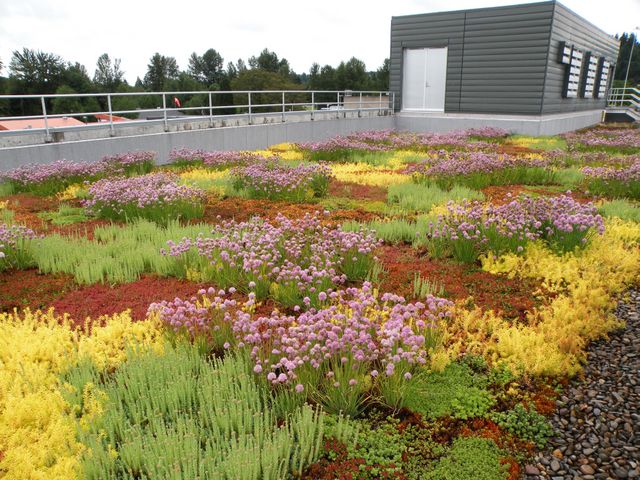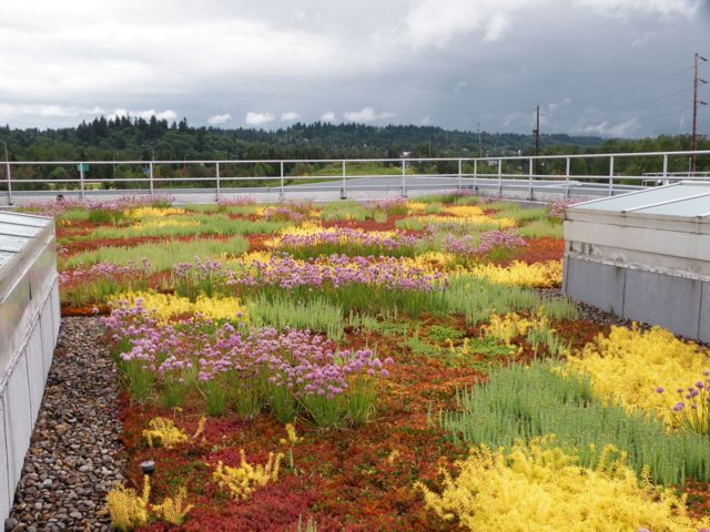 Originally installed as plugs in the fall of 2010, there are a total of three roofs on the project. The roofs are irrigated with greywater, and the water treatment personnel monitor the water quality of the runoff from the roofs.